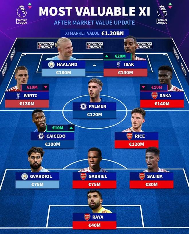 薩卡(阿森納)1.4億歐元、賴斯(阿森納)1.2億歐元、帕爾默(切爾西)1.2億歐元、莫伊塞斯-凱塞多(切爾西)1億歐元、維爾茨(利物浦)1.3億歐元