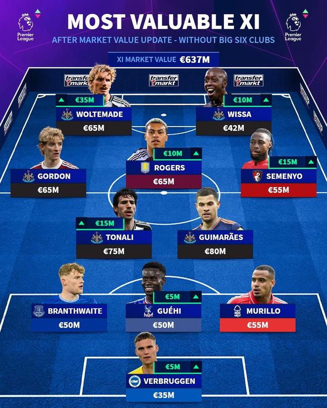 在更新了英超球員身價後,德國轉會市場網站列出了英超非BIG6最貴陣容,沃爾特馬德領銜紐卡5人入選。
